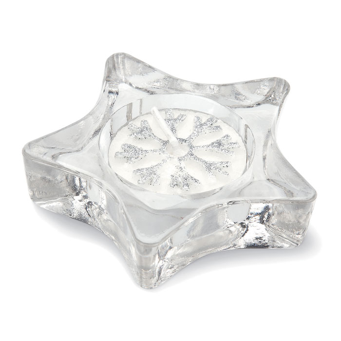 Sternförmiger Teelichthalter aus Glas. Geschenkverpackung mit transparentem Deckel und silbernem Band. Teelicht enthalten.