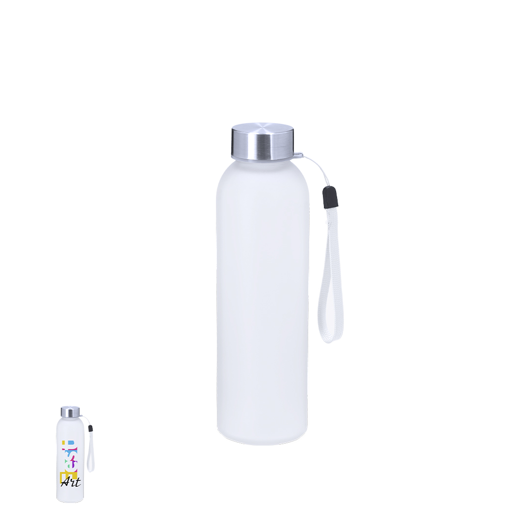 500 ml Flasche, ideal für Sublimationsmarkierung. Körper aus frosted Glas und BPA-freiem Edelstahlverschluss. Mit praktischem Transportkordel.