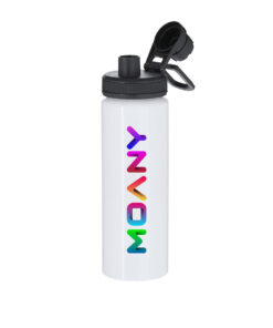 Aluminiumkanister mit einem Fassungsvermögen von 800 ml. In glänzendem Weiß, speziell entworfen für Sublimationsdruck. Enthält einen schwarzen Deckel mit Schraubverschluss, grau Silikon-Griff für optimale Versiegelung, Dosierer und verstellbaren Tragegriff. BPA-frei.