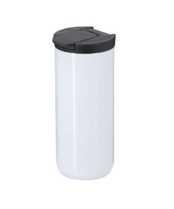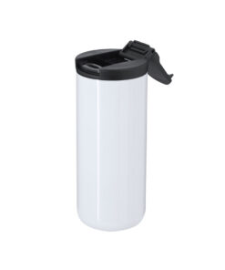 Thermobecher aus doppelwandigem Edelstahl mit 370 ml Fassungsvermögen. Speziell entworfen für Sublimationsdruck, glänzendes Weiß. Ausgestattet mit einem Dosierer auf dem Deckel in Schwarz, der Leckagen verhindert und BPA-frei ist.