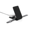Luxuriöses und faltbares kabelloses 3-in-1-Ladegerät aus RCS-zertifiziert recyceltem PU. Gesamter recycelter Inhalt: 5%, bezogen auf das Gesamtgewicht des Artikels. Die RCS-Zertifizierung gewährleistet eine vollständig zertifizierte Lieferkette für die recycelten Materialien. Das kabellose Ladegerät ist auf der Vorderseite mit einem magnetischen kabellosen 15W-Ladegerät ausgestattet. Auf der Rückseite befindet sich ein zusätzliches kabelloses 5W-Ladegerät, das für Ohrhörer oder andere kleine kabellos aufladbare Geräte geeignet ist, sowie ein kabelloses 2,5-W-Ladegerät für Ihre Apple Watch. Inklusive 120cm langem, RCS-zertifiziert recyceltem TPE-Kabel. Verpackt in FSC®-Mix-Kraftverpackung. Artikel und Zubehör 100% PVC-frei. Input: 9V/3A für optimale Nutzung. Output: Vorderseite: 9V/1.1A; 9V/1.67 A/(15W), Kopfhörer: 5V/1A (5W), Uhr: 5V/0,5A.