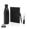 Dieses luxuriöse Geschenkset enthält alles, was Sie brauchen, um Ihren Arbeitstag komfortabel und stilvoll zu meistern. Die doppelwandige 480ml-Wasserflasche besteht aus recyceltem Edelstahl und verfügt über eine Vakuumisolierung, die Ihre Getränke stundenlang heiß oder kalt hält. Dank des auslaufsicheren Deckels können Sie sie bedenkenlos transportieren. Damit Sie Ihre wichtigsten Schlüssel immer griffbereit haben, enthält das Set einen hochwertigen Swiss Peak-Schlüsselanhänger mit glänzender Metallic-Oberfläche und einem wunderschön gearbeiteten PU-Lederband. Sie müssen unterwegs Ideen festhalten? Das Set enthält außerdem einen eleganten blauschreibenden Business-Kugelschreiber mit einer Schreiblänge von 1000m, sowie ein Soft-Touch-Notizbuch aus recyceltem Polyester-PU. Im Inneren finden Sie 160 cremefarbene Seiten aus Recyclingpapier. Alle Artikel sind RCS-zertifiziert.