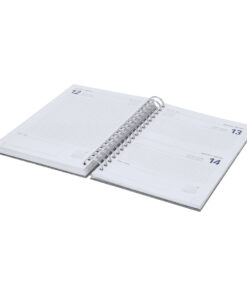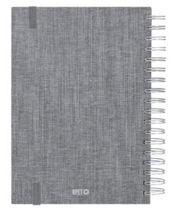 Ringbuch-Tagebuch im B5-Format aus weichem und strapazierfähigem RPET, mit Hartdeckeln und Gummibandverschluss. Inklusive Präsentationsbox aus Kraftpapier und RPET-Logo.Gestaltung der Tagesseite, mit einem Bereich für mikroperforierte Ecken. In 2 Sprachen: Englisch und Spanisch.Das RPET-Material wird aus recyceltem Kunststoff hergestellt, wodurch die Wiederverwendung von Plastikabfällen gefördert und die Nachhaltigkeit des Planeten unterstützt wird.