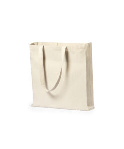 Tasche aus Baumwolle, natürliches Finish und 220g/m2. Abgenäht, mit Bodenfalte und mittelstarken, verstärkten Griffen (60 x 2,5 cm). Widerstandsfähigkeit bis zu 10 kg Gewicht.