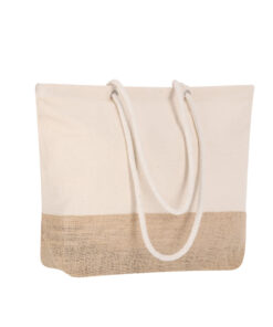 Tasche aus unserer Naturlinie in einer Kombination aus Jute- und Baumwollmaterialien. Größe 48 x 35 + 15 cm, mit genähter Verarbeitung und langen, verstärkten Henkeln mit 90 cm Länge aus Baumwolle. Widerstandsfähig bis zu 9 kg Gewicht.