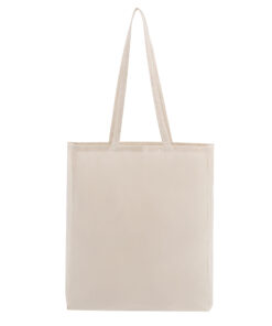 Tasche aus Baumwolle, natürliches Finish und 140g/m2. Abgenäht, mit Bodenfalte und langen verstärkten Griffen (70 x 2,5 cm). Belastbar bis zu einem Gewicht von 6 kg.