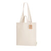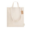 Tasche hauptsächlich aus 140 g/m2 recycelter Baumwolle. Mit doppeltem Tragegriff: lange Griffe 70 x 2,5 cm und kurze Griffe 30 x 2,5 cm. Mit Recycling-Baumwoll-Label. Belastbarkeit bis zu 6 kg.