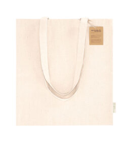 Tasche hauptsächlich aus 240 g/m2 recycelter Baumwolle. Lange verstärkte Tragriemen mit 70cm, genähter Ausführung. Logo auf seitlichem Etikett und Tragkraft bis zu 7 kg.