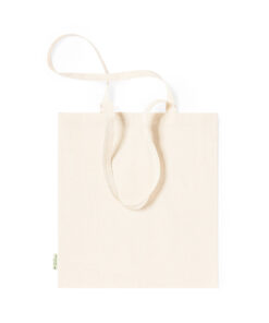 Tasche aus Bio-Baumwolle 180g/m2 und in Naturtönen. Genähtes Ausführung mit 70 cm langen, verstärkten, mittleren Griffen. Widerstandsfähigkeit bis zu 8 kg, einschließlich Bio-Baumwolle Etikett und Hangtag aus recyceltem Karton.