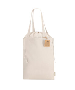 Tasche überwiegend aus 260 g/m2 recycelter Baumwolle mit Oberkordelverschluss, hergestellt aus Netzgewebe. Lange 70 cm-Griffe mit Verstärkung, genäht. Logo am seitlichen Etikett und Tragfähigkeit bis zu 8 kg.