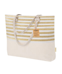 Tasche aus recyceltem Baumwollmaterial von 210 g/m2. Gestreiftes Design in weißer Kombination mit glitzernden goldenen Streifen und glatter, natürlicher Fläche. Lange Griffe im Kordelstil, verstärkt mit Metallringen. Enthält ein externes Etikett mit dem Logo für recycelte Baumwolle.