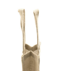 Robuster, laminierter Jutebeutel für 750 ml Weinflasche. Mit transparentem Fenster sowie verstärkten Rändern und Griffen.