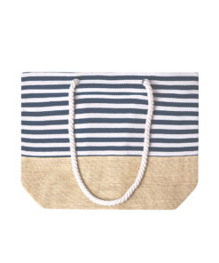 Tasche aus widerstandsfähiger 450g/m2 Baumwolle, mit Juteboden. Abgenäht und mit Reißverschluss, mit blau-weißem Streifenmuster. Lange Griffe aus weißer Baumwolle in Seilform, mit Ösen verstärkt. Widerstandsfähig bis zu einem Gewicht von 13 kg.