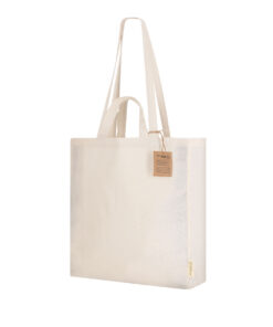 Tasche mit Falten hauptsächlich aus 140 g/m2 recycelter Baumwolle. Mit doppeltem Tragegriff: lange Griffe 70 x 2,5 cm und kurze Griffe 30 x 2,5 cm. Mit Recycling-Baumwoll-Label. Belastbarkeit bis zu 6 kg.