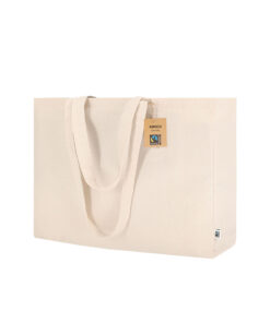 Tasche hauptsächlich aus 220g/m2 Baumwolle. Mit Fairtrade-Zertifizierung, einem solidarischen und alternativen Handelssystem, das die Entwicklung der Gemeinden und den Kampf gegen die Armut fördert. Mit genähter Ausführung mit Bodenfalten, langen verstärkten 70cm Tragriemen und einer Tragkraft bis zu 10kg. Inklusive Fairtrade-Etikett und charakteristischem Hangtag aus Recyclingpapier.