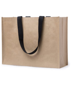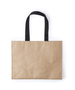 Umweltfreundliche Tasche aus einer Kombination von Papier und Faservlies (140 g/m2). Mit 70 cm langen Henkeln in Schwarz und Steppnähten. Belastbar mit bis zu 7 kg.