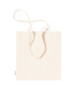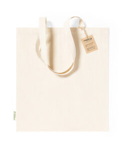 Tasche aus Bio-Baumwolle 140g/m2 und in natürlicher Farbe. Genähtes Ausführung mit 70 cm langen, verstärkten, mittleren Griffen. Widerstandsfähigkeit bis zu 8 kg, einschließlich Bio-Baumwolle Etikett und Hangtag aus recyceltem Karton.