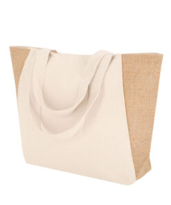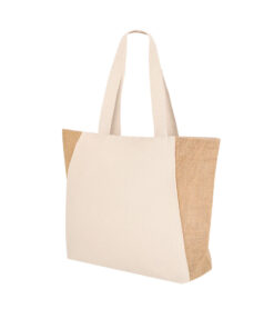 Tasche aus hauptsächlich 360 g/m2 Baumwolle und Jute. Mit langen verstärkten Baumwollgriffen. Mit Faltboden und belastbar bis 8 kg.