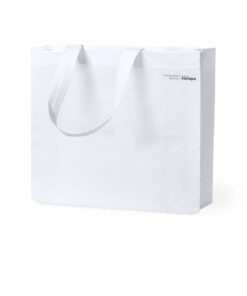 Linie „Natur“ Tasche, hergestellt aus 120g/m2 recyceltem Vliesstoff mit Laminierung. Hergestellt in Europa, mit verschweißter Oberfläche, Seitenfalte, langen Griffen und Öko/Made-Emblem auf der Tasche.