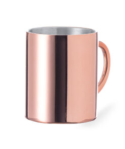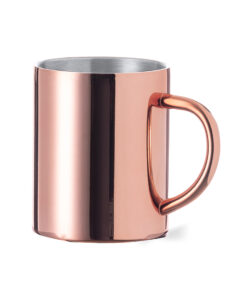 Becher mit 280 ml Fassungsvermögen aus doppelwandigem Edelstahl mit galvanisierter Kupferbeschichtung auf der Außenseite. Innovatives Design mit glänzender Oberfläche. Präsentiert in einer exklusiven, individuellen schwarzen Designbox.