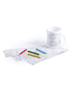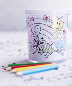 Tasse zum Bemalen, mit 320 ml Fassungsvermögen. Außenseite der Tasse mit abnehmbarer, transparenter Abdeckung zum Einlegen der Blattes. Innenseite aus weißem Polypropylen (PP). Mit 4 Blättern zum Bemalen und 4 Buntstiften. Präsentiert in einer individuellen Box.