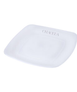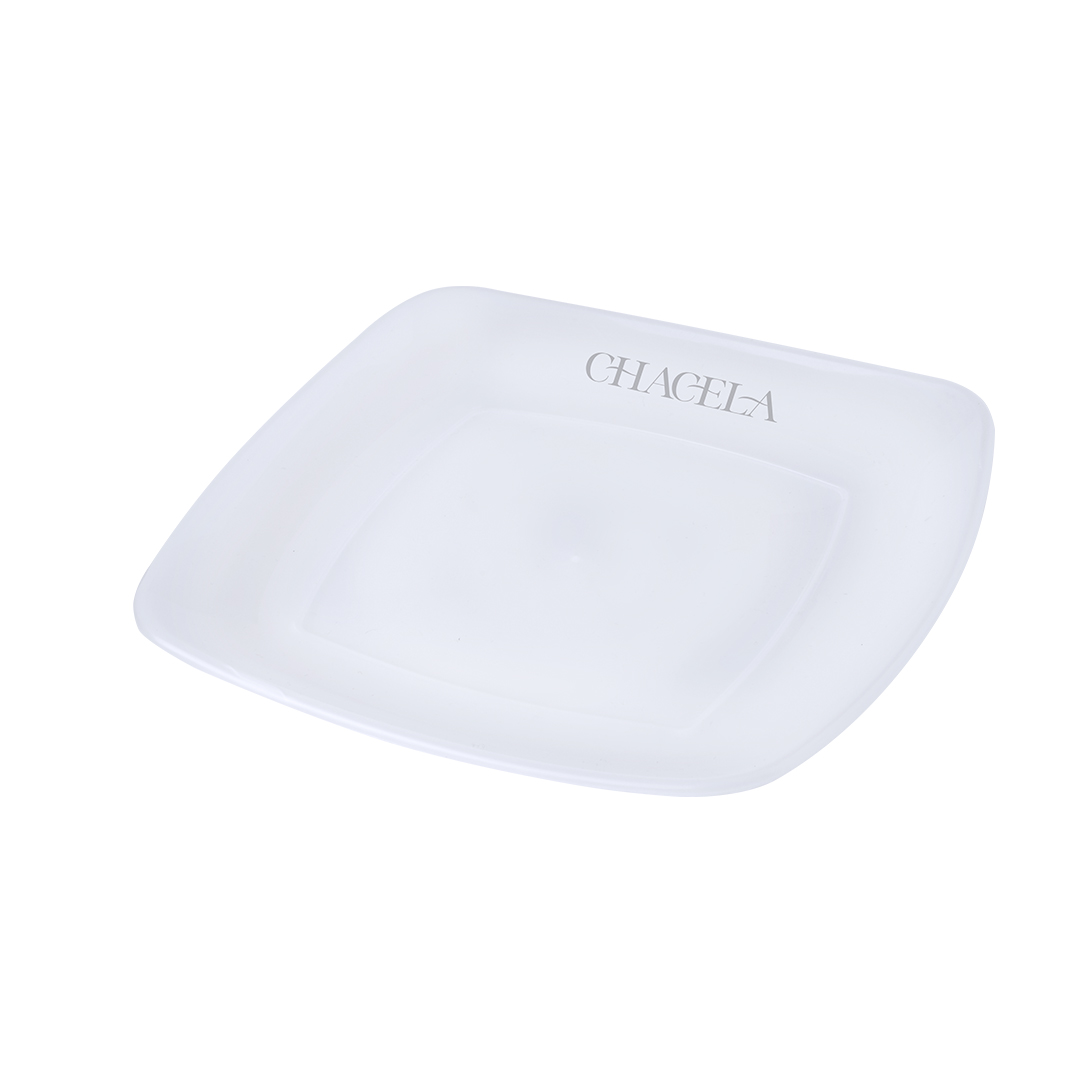 Flache Schale aus starkem und flexiblem PP-Material. Quadratische Form, wiederverwendbar und in durchsichtiger Ausführung.