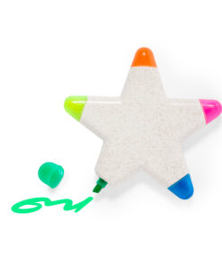 Original fünffarbiger Textmarker aus Weizenstroh. Mit sternförmigem Körper in glatter, glänzender Oberfläche, speziell für den Vollfarbdruck konzipiert. Mit durchscheinenden Hauben in passender Farbe zum Marker. Präsentiert in einer recycelten Papiertüte.