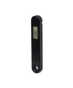 Digitales Thermometer mit Metallfühler. Optimal zum Messen der Temperatur im Inneren von Gegenständen dank des Metallstiftes. Praktischer Klappmechanismus für eine bequeme Aufbewahrung, mit Ring und Magnet auf der Rückseite. LCD-Display, mit ON/OFF-Taste und der Möglichkeit, in Grad Celsius (Cº) oder Fahrenheit (ºF) zu messen. Temperaturbereich zwischen -50ºC und bis zu 300ºC, mit Bedienungsanleitung in Englisch und Spanisch. Betrieben mit einer Knopfbatterie (nicht enthalten) und einzeln in einer Kraft-Design-Box präsentiert.