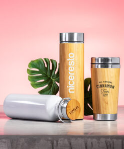 Thermosflasche Trinkflasche mit 500 ml Fassungsvermögen. Außen aus Bambus und innen aus Edelstahl. Sicherheitsschraubverschluss aus Edelstahl mit Oberseite aus Bambus. Präsentiert in einer individuellen, attraktiven Designbox.