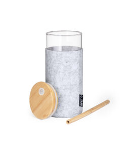 Hochwertiger Trinkbecher mit 450 ml Fassungsvermögen. Der Körper besteht aus BPA-freiem Borosilikatglas, das eine außergewöhnliche Festigkeit und Haltbarkeit bietet, seine Lebensdauer verlängert und unzählige Male wiederverwendet werden kann. Inklusive weicher, nachhaltiger RPET-Filzhülle, Bambus-Schnappdeckel mit Strohhalmloch und wiederverwendbarem Bambus-Strohhalm. Mit unverwechselbarem RPET-Etikett. Präsentiert in individueller Ökodesign-Box.Recycelter RPET-Filz ist das Ergebnis der Kombination des Recyclingprozesses von Kunststoffen mit der alten Technik der Filzherstellung. Das Ergebnis ist ein Öko-Trendmaterial, das nicht nur recycelt, sondern auch wiederverwertet werden kann.