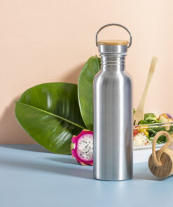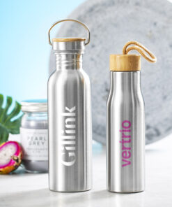 Nature Line Flasche mit 550 ml Fassungsvermögen. Gehäuse aus Edelstahl und Bambusstopfen mit Trageband. BPA-frei und präsentiert in einer attraktiven Öko-Design-Box.