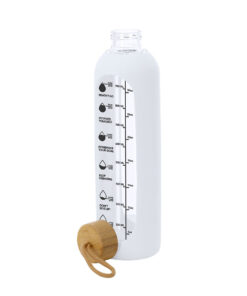 Flasche aus 1L Glas, entworfen, um eine angemessene Hydration zu fördern. Mit einer Silikonhülle, die schützt und einen bequemen und sicheren Halt bietet.Inklusive Kapazitätsanzeige in Litern und Unzen, begleitet von motivierenden Sätzen, die dazu inspirieren, eine angemessene Hydration täglich aufrechtzuerhalten. Der Deckel, aus Bambus gefertigt, hat eine praktische Kordel für einfachen Transport. BPA-frei.