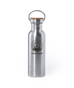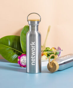 Nature Line Becher mit 800ml Fassungsvermögen. Korpus aus Edelstahl und Bambuskappe mit original Metall-Tragegriff. Präsentiert in einer attraktiven Öko-Design-Box.