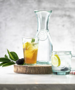 Linie „Natur“ Karaffe mit 800ml Fassungsvermögen. Hergestellt in Europa aus recyceltem Glas mit GRS-Zertifizierung (Global Recycled Standard), die die recycelte Herkunft des für die Herstellung des Produkts verwendeten Materials bestätigt. Präsentiert in einer Schachtel aus recyceltem Karton mit Sichtfenster.