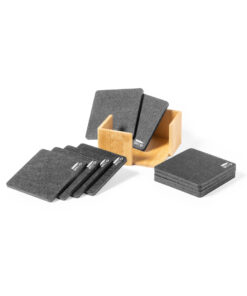 Set mit 10 Untersetzern in der Naturlinie. Hergestellt aus Felt RPET, das Ergebnis der Kombination der Recyclingprozesse von Kunststoffmaterialien mit der tausendjährigen Technik der Filzherstellung, was zu einem Öko-Trendmaterial führt, das nicht nur recycelten Ursprungs ist, sondern auch recycelbar ist. Bambusständer und Untersetzer mit RPET-Logo. Das Set wird in einer individuellen Box mit Kraftpapier-Design präsentiert.