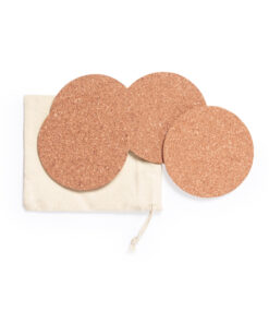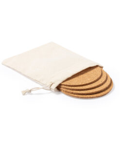Set mit 4 Untersetzern der Naturlinie, hergestellt aus Naturkork. Präsentiert in einem Beutel aus Baumwolle mit Kordelzugverschluss.