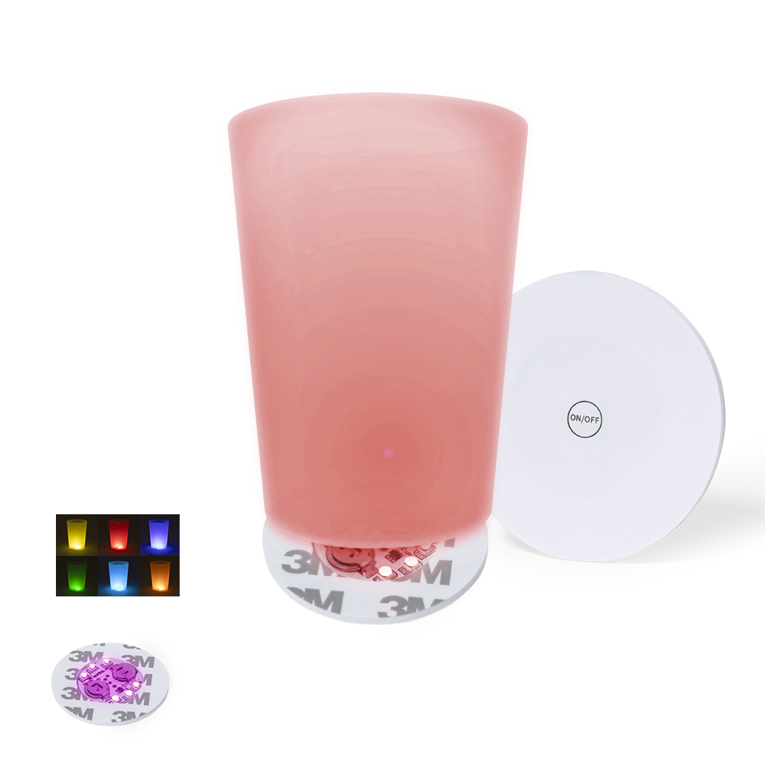 Origineller Untersetzer mit 6 LEDs zur Beleuchtung von Getränken. Mit Knopf am Sockel für verschiedene Beleuchtungspositionen: in festen oder gemischten Farben. Es wird mit einem Klebeband am Boden eines beliebigen Glases befestigt und wird von zwei Knopfzellen (im Lieferumfang enthalten) betrieben.