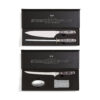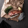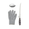 Das Set besteht aus einem Filetiermesser, einem stahlgewebten Handschuh und einer Metallseife. Der Handschuh hilft dabei, den rutschigen Fisch besser zu halten und schützt vor eventuellen Verletzungen. Die Metallseife entfernt Fisch- und Zwiebelgerüche, was gewöhnliche Seife nicht schafft. Die Klinge besteht aus deutschem X50CrMoV15 Stahl und der Griff ist aus Pakkaholz. Der Griff ist ergonomisch und durch die ausbalancierte Masse von Griff und Klinge ist das Messer bequem und einfach zu handhaben.