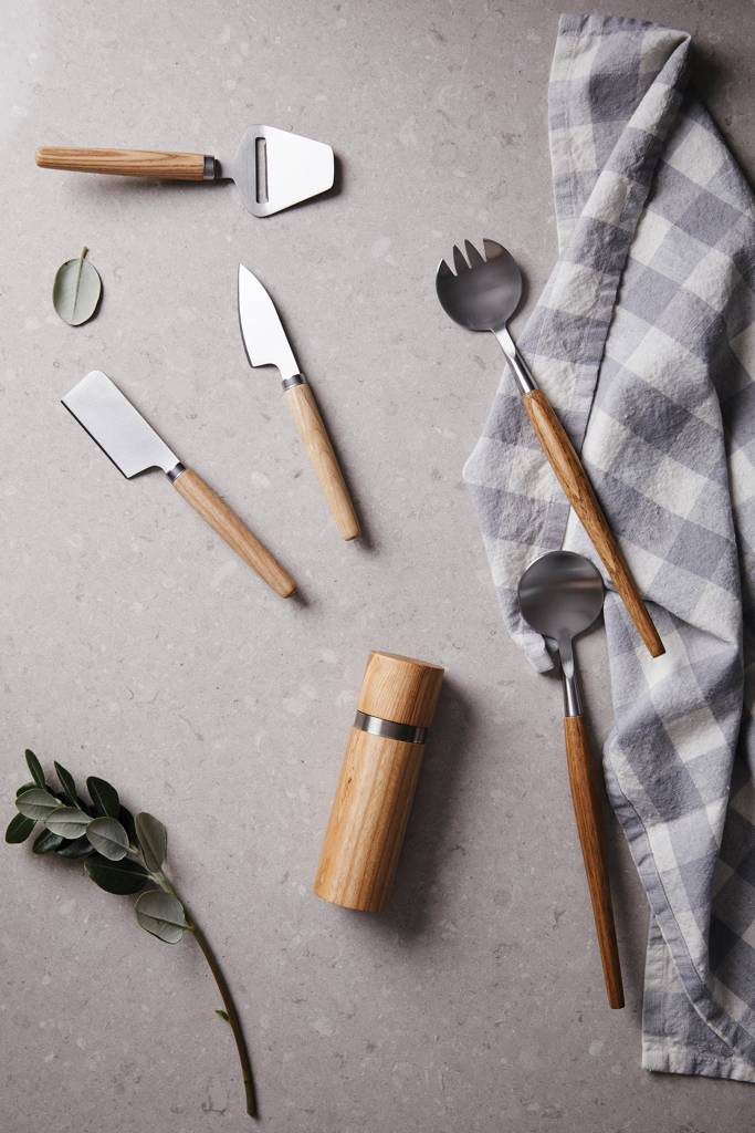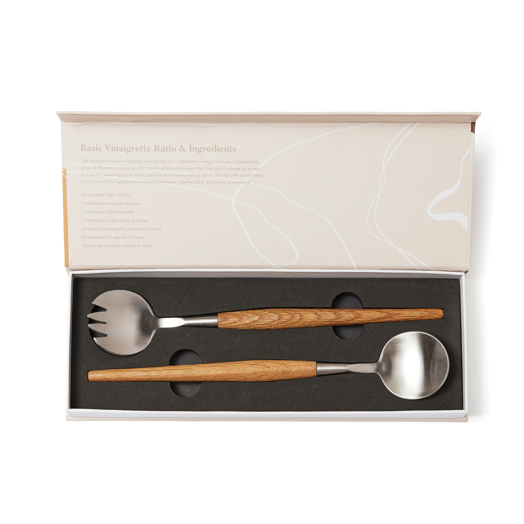 Servierbesteck aus Stahl mit einem Griff aus Eichenholz. Ein klassisches und minimalistisches Design im reinen skandinavischen Stil. Das Servierbesteck eignet sich perfekt für Abendessen und insbesondere für Mahlzeiten zu Hause. Verpackt in einer exklusiven Geschenkbox.