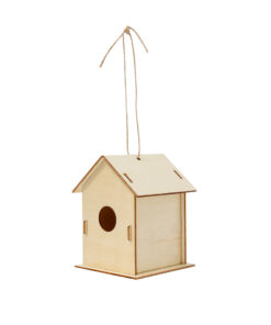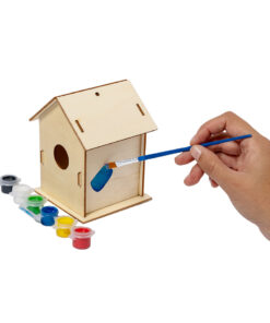 Hängendes Vogelhaus aus natürlichem Holz. Enthält Pinsel und Zeichnungen auf Wasserbasis in verschiedenen Farben.