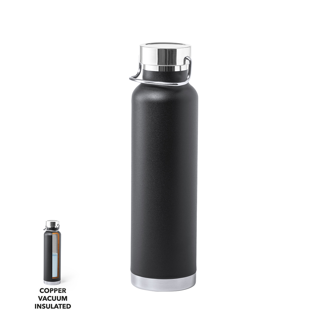 Thermosflasche aus Edelstahl, mit Doppelschicht und Vakuumkupferisolierung. Dieser ermöglicht, die Wärme und Kälte für eine längere Zeit zu halten und dies 12 bzw. 48 Stunden. 650 ml Fassungsvermögen und in einer Vielzahl von Metallicfarben erhältlich. Präsentiert in einer attraktiven Designbox.