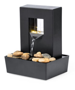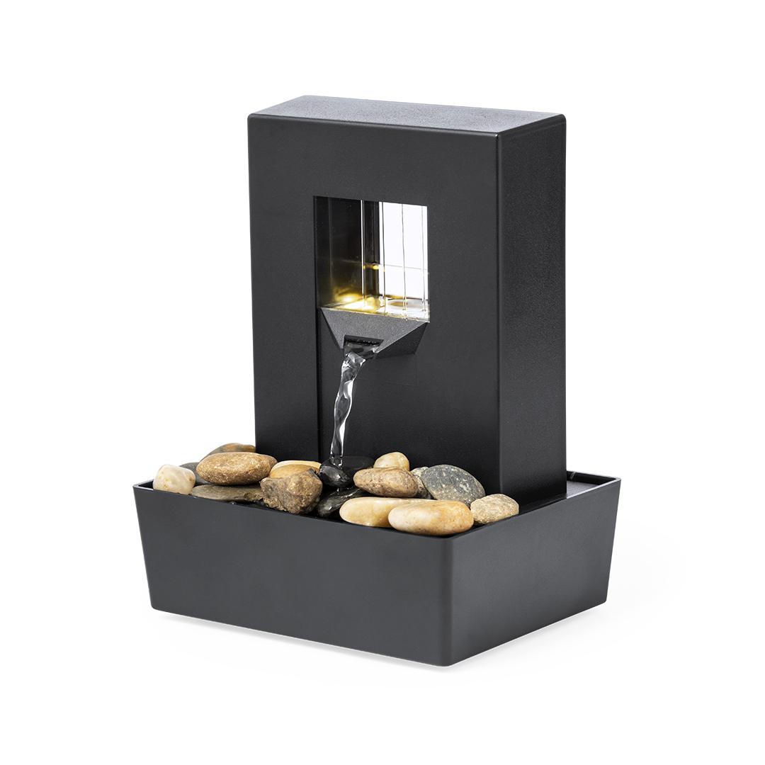 Tragbarer, endloser Wasserbrunnen mit LED-Leuchten. Wasserkaskade über Natursteine, ideal zur Dekoration oder für entspannende Momente. Darunter ein Wassertank und eine von LEDs in Naturtönen beleuchtete Struktur, durch die Wasser fließt. Betrieb mit 3 AA-Batterien (nicht im Lieferumfang enthalten). Präsentiert in einer Kraft-Design-Box.