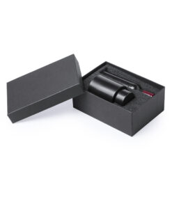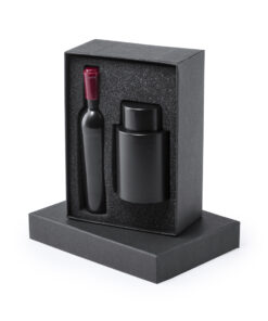 Originelles Wein-Set mit Korkenzieher in Form einer Weinflasche und Vakuumpumpe. Präsentiert in einer individuellen Schachtel in Schwarz mit gestanztem Schaumstoff im Inneren.