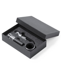 Ultimatives Weinset in schlichtem Schwarz, präsentiert in einem individuellen Etui mit gestanztem Schaumstoffeinsatz und weißer Schutzhülle. Inklusive Tropfverschluss, Korkenzieher aus Edelstahl und Vakuumpumpdeckel.