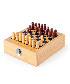 Einzigartiges Schach-Weinset – Teile im Lieferumfang enthalten – aus natürlichem Bambus. Mit Sicherheitsverschluss und Zubehör aus Edelstahl und Bambus. Inklusive Korkenzieher mit Kapselschneider und Flaschenöffner; Stopfen, Dekanter und Tropfstopp. Präsentiert in einem Einzeletui mit weich gestanzter und geschäumter Innenseite.