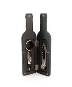 Originelles flaschenförmiges Wein-Set mit angenehm weicher Oberfläche, Magnetverschluss und Accessoires aus Edelstahl. Enthält Korkenzieher mit Kapselschneider und Flaschenöffner sowie Dosierkappe und Tropfring. Präsentiert in einer individuellen Box, ausgekleidet mit weichem Schaumstoff.