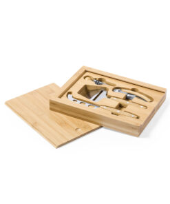 Ultimatives Wein- und Käseset aus 4 Teilen. Hergestellt aus Bambus, mit Schneidebrett Abdeckung und Metall-Zubehör mit Bambusgriff. Einschließlich Korkenzieher, Deckel, Messer und Käsereibe. Präsentiert in einer individuellen Ökodesign-Box.