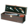 Geschenkset mit Holzbox und 4 Weinaccessoires: Kellnermesser, Flaschenverschluss, Weinkragen und Ausgießer. Exklusive Wein.