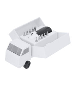 Werkzeugsatz mit Etui in Form eines Lastwagens. Mit 15 Werkzeugen. Enthält einen Präzisionsschraubendrehersatz (flach und Philips) und einen Multifunktionsgriff mit wechselbaren flachen und sternförmigen Köpfen.