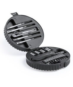 20-teiliges Werkzeugset in Koffer mit Rad-Design. Enthält einen Satz Präzisionsschraubendreher, Befestigungswerkzeug, Schraubendreherköpfe (Schlitz und Kreuz), Sechskantschlüssel und Teppichmesser. Präsentiert in einer individuellen Box.